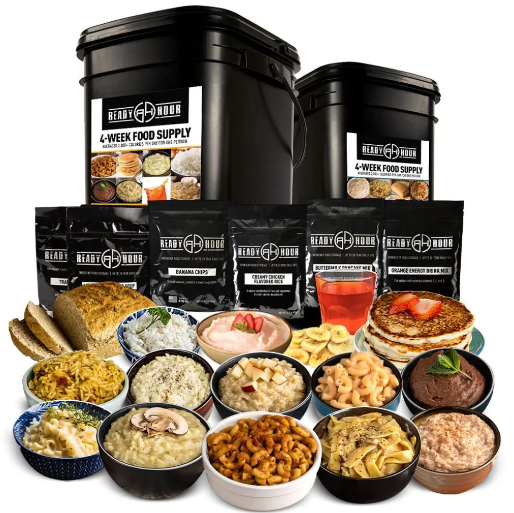 - 4-Week Food Supply by Ready Hour – 2,000+ calories per day! Up to 25-year shelf life. Breakfasts, lunches, dinners, and drinks. Hearty, tasty, and easy-to-prepare meals. Made in the U.S.A. from domestic and/or imported ingredients.