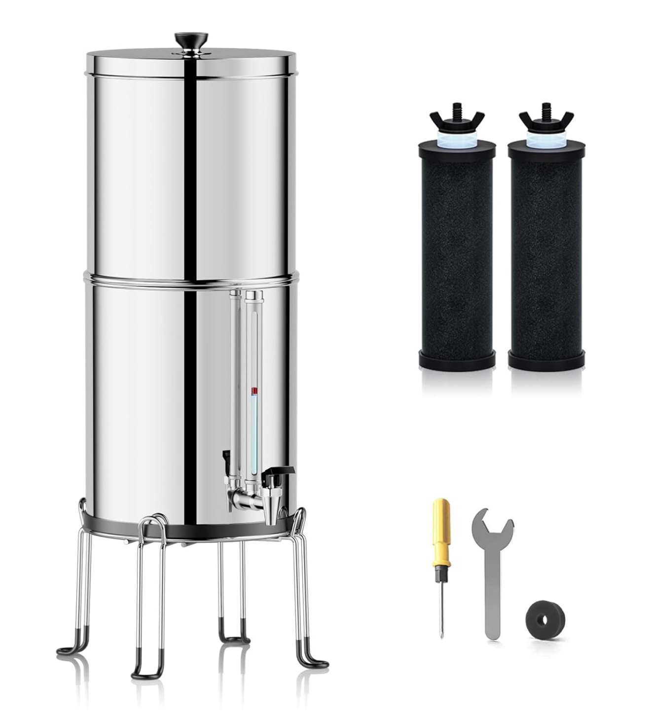 Purewell 3-Stage 0.01μm Ultra-Filtration Gravity Water Filter System, 304 Stainless Steel Countertop System with 2 Filters, Metal Water Level Spigot and Stand, Reduce 99% Chlorine, 2.25G, PW-OB-K