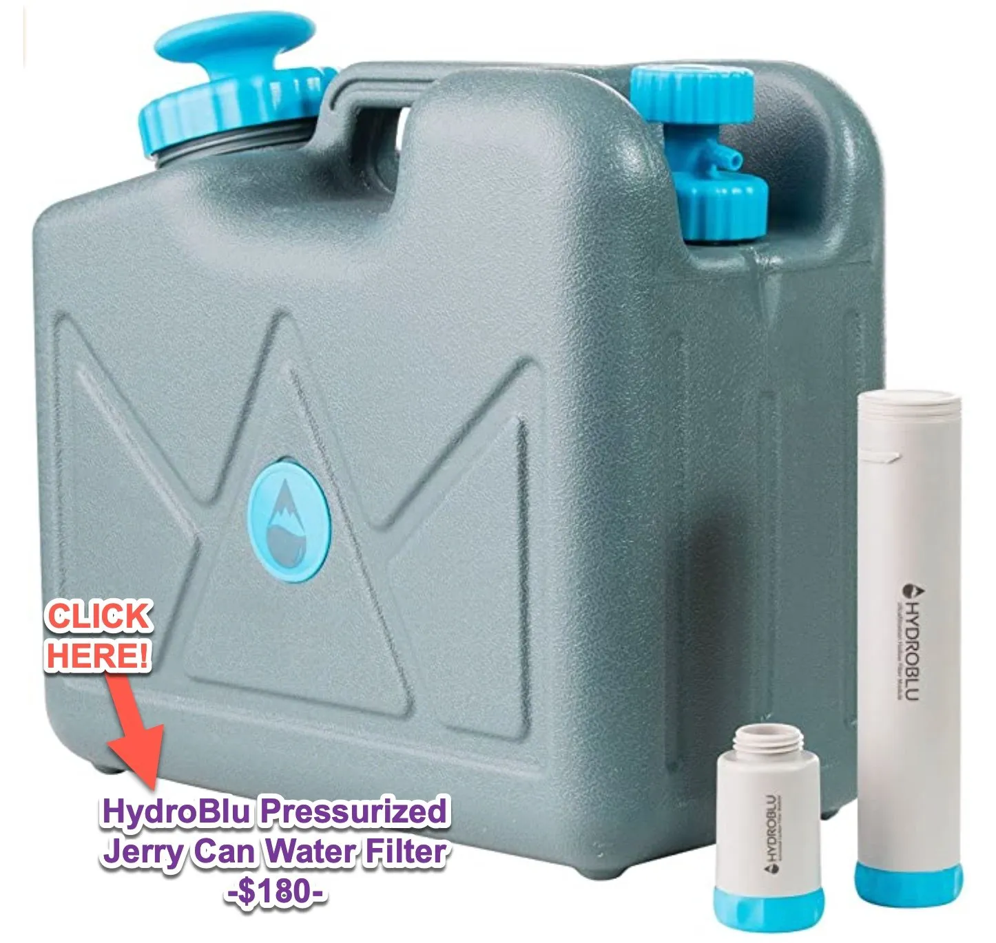 The Pressurized Jerry Can water filter from HydroBlu is a lightweight system that allows for easy carry for filling from almost any water source. The entire purification process is automated by pressurizing the Jerry Can with the non-electric hand pump.